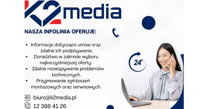 K2 MEDIA jest tu, aby Ci pomóc! Nasza infolinia działa codziennie, aby odpowiadać na Twoje pytania i rozwiązywać problemy szybko i sprawnie.